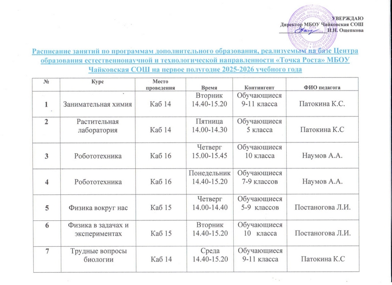 Режим занятийРасписание занятий по программам внеурочной деятельности, реализуемым на базе Центра образования естественнонаучной и технологической направленности «Точка Роста» МБОУ Чайковская СОШ на первое полугодие 2025-2026 учебного годаРасписание учебных занятий, реализуемых на базе Центра образования естественнонаучной и технологической направленности «Точка Роста» МБОУ Чайковская СОШ на первое полугодие 2025-2026 учебного года. |